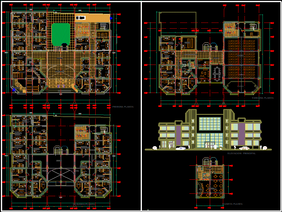 This Municipal Office Building DWG design includes ground, first, and second-floor plans with modern elevation layouts ideal for architects and engineers.