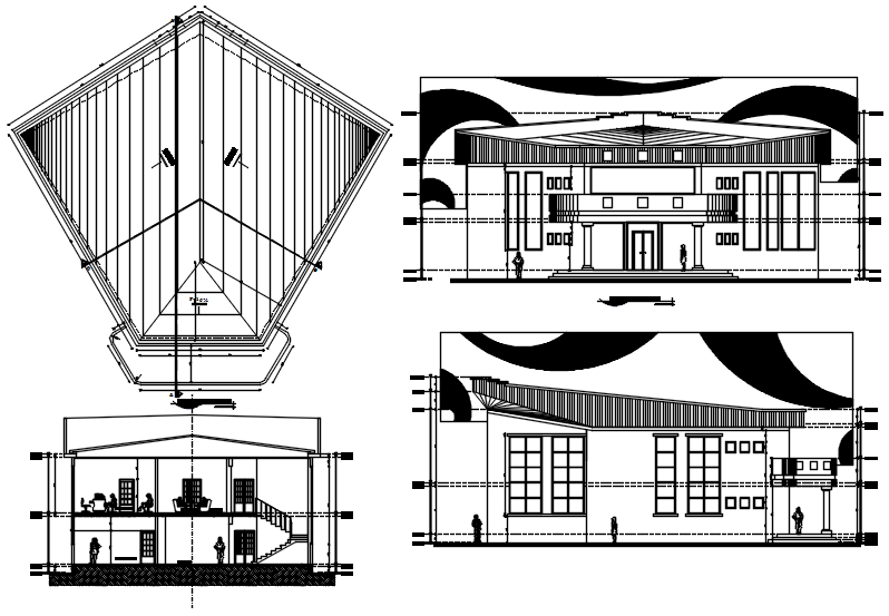 Drawing of university design in AutoCAD which provide detail of front elevation, side elevation, detail of section, detail of floor level, etc.