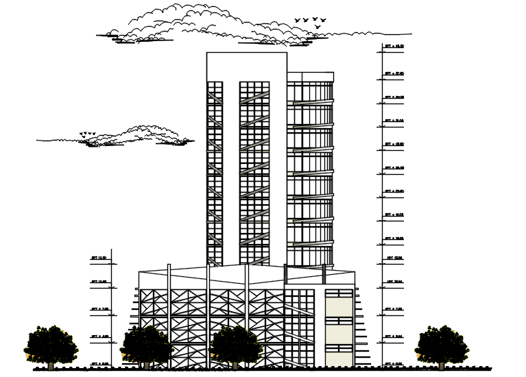 Drawing of office building design in dwg file which provides detail of side elevation of the building, detail of floor level, etc.