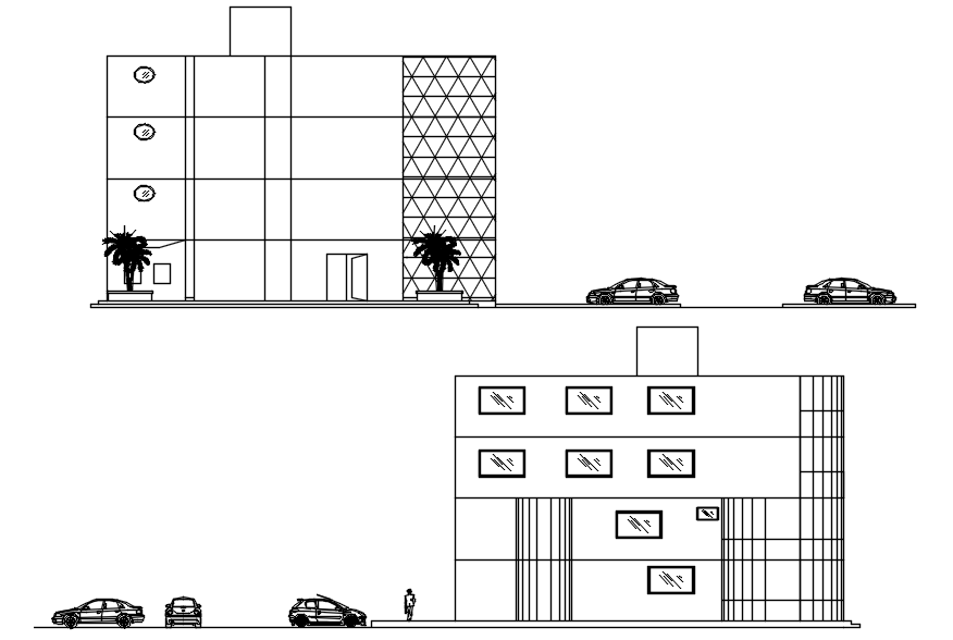 Elevation drawing of bank design in dwg file which provides detail of front elevation, back elevation, detail of parking space, etc.