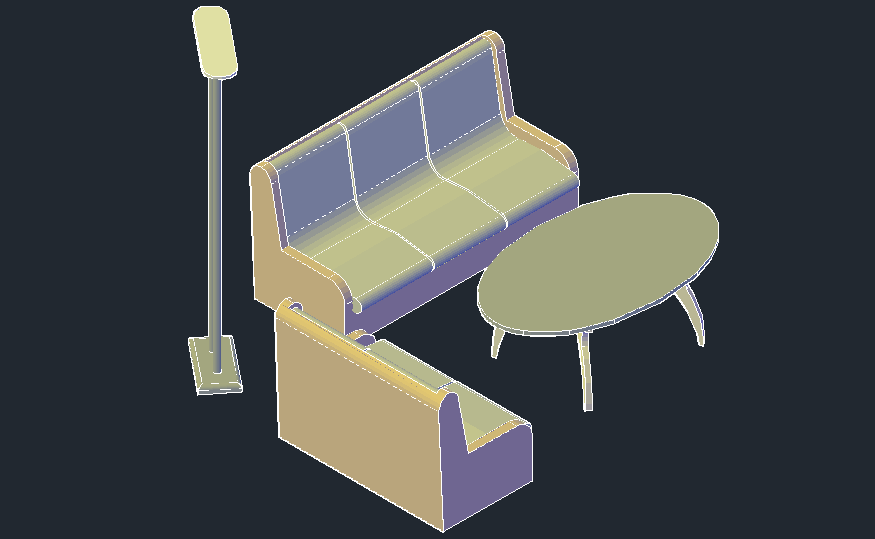Dwg file of sofa set in 3D it includes the sofa,2 seaters,3 seaters, center table,etc
