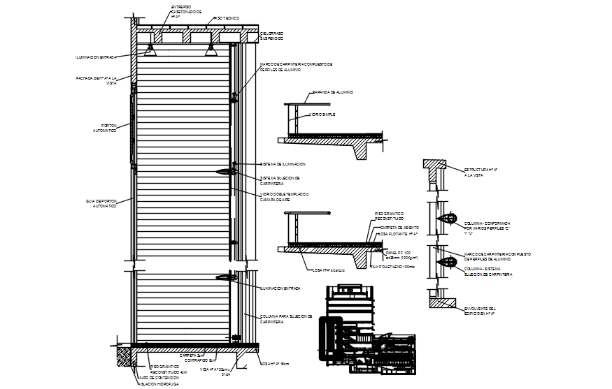 Autocad drawing of corporate building facade it includes front facade, aluminum railing,etc