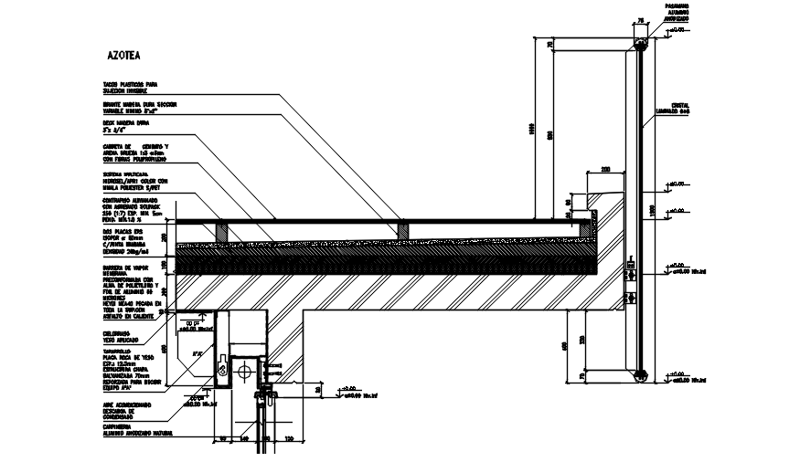 Autocad drawing of construction detail it includes detail of deck roof,and glass railing,etc