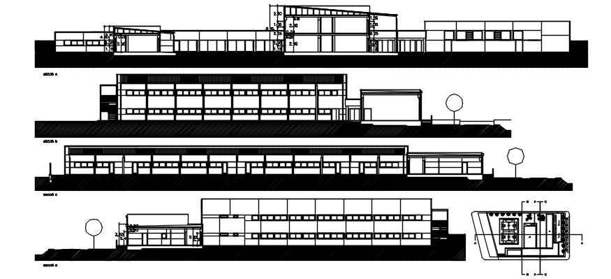 School design with elevation and section in AutoCAD which provide detail of different elevation and section, detail of floor level, etc.