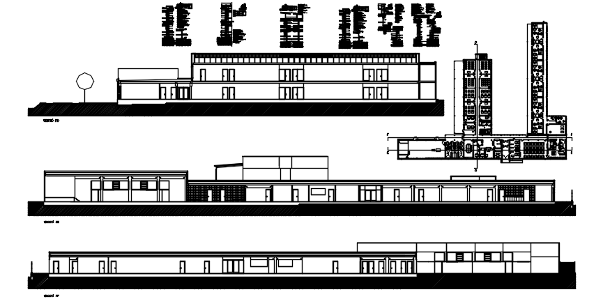 Autocad drawing of school building design which includes detail of different section, detail of different elevation, detail of floor level, detail of foundation structure, etc.