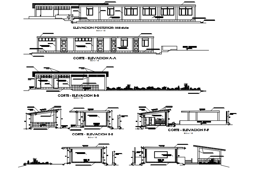 Drawing of school design in AutoCAD which includes detail of front elevation, back elevation, side elevation, detail of different sections, floor level, etc.