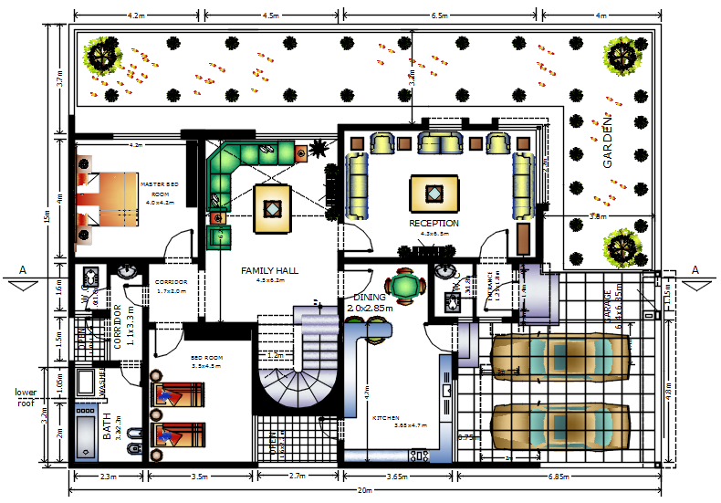 Dwg file of house design with furniture details which provide detail of hall, bedroom, kitchen with dining area, bathroom, toilet, etc.
