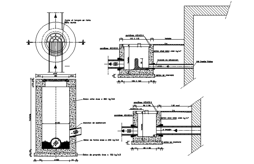 Autocad drawing of a construction detail of pipes it includes plan, elevation, a section of it,etc
