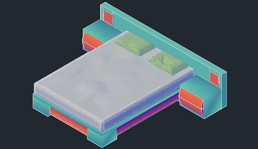 3D drawing of a double bed in AutoCAD it includes a double bed,side table, mattress, pillows, headrest,etc