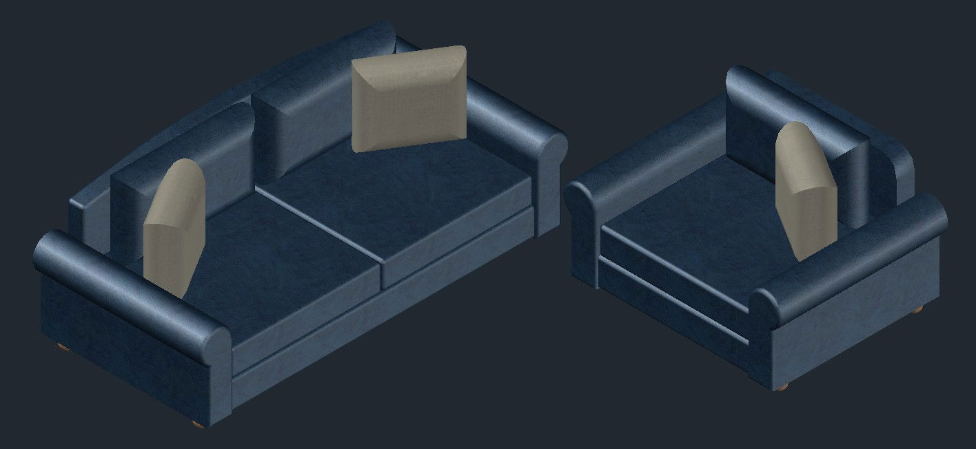 3D drawing of sofa set in dwg file it includes two-seater,one seater it includes leather material on it, seating area,backrest,etc