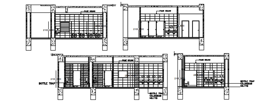 Sectional elevations of the toilet in dwg file it include floor levels,urinals,w.c,basin,mirrors,mirrors,etc