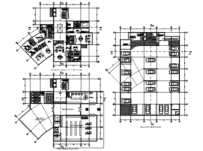 Hotel design with details dimension in dwg file which provides detail of reception area, hall, rooms, kitchen, dining area, washroom, toilet, etc it also gives detail of the parking plan.