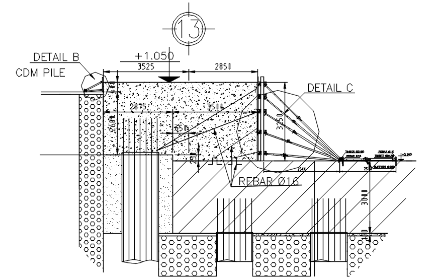 Construction detail in dwg file it includes CDM pile,rebar,timber support,etc