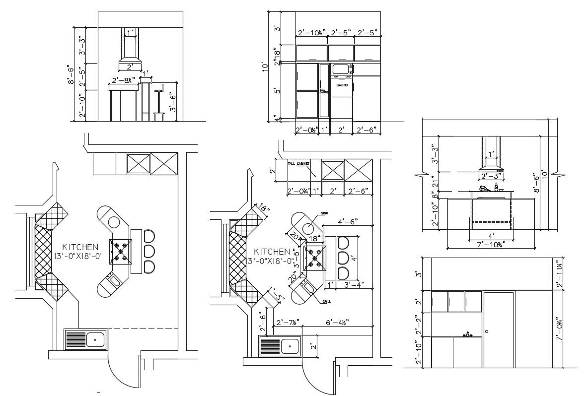 Kitchen layout with elevations in dwg file it include space planning of kitchen, alternate options, sections it also includes serving platform,countertop, drawers, overhead units,etc