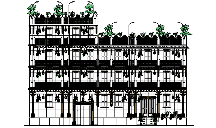 Autocad drawing of traditional theme based hotel it includes front facade it also includes exterior view,floor level,jali work, terrace area,garden area,etc