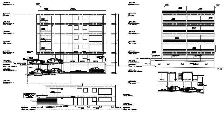 Drawing of a residential building with elevation details in autocad which provides detail of front elevation, detail of floor level, detail of the section, detail of underground parking, etc.