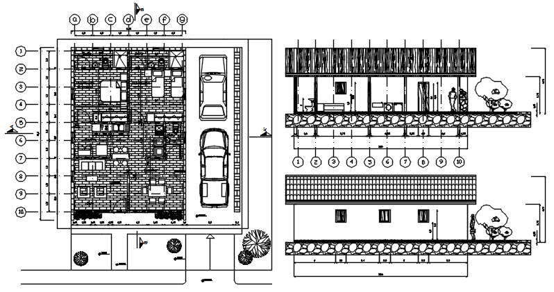 Plan of house with detail dimension in dwg file which provides detail of drawing room, bedroom, kitchen, dining room, bathroom, toilet, parking area, etc it also gives detail of sections.