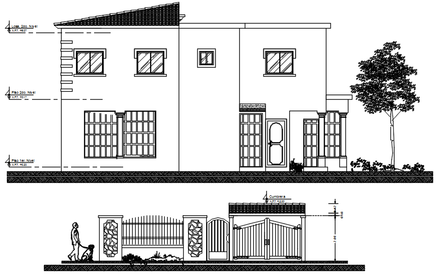 Elevation drawing of bungalow design in autocad which provide detail of side elevation of the bungalow, detail of the main gate, etc.