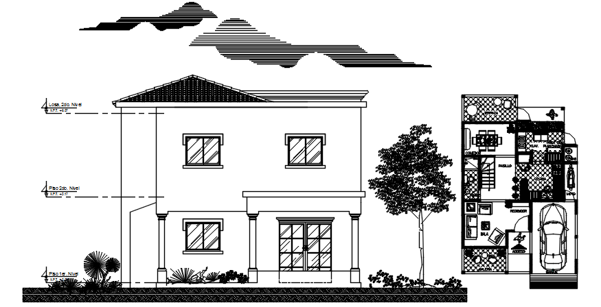 House plan with elevation details in dwg file which provide detail of drawing room, bedroom, kitchen, dining room, bathroom, toilet, car parking, etc it also gives detail of back elevation.