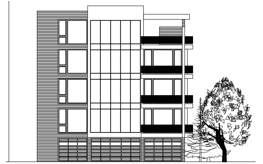 4 storey Apartment building design in autocad which provide detail of back elevation of the building, detail of lawn area, different floor, etc.