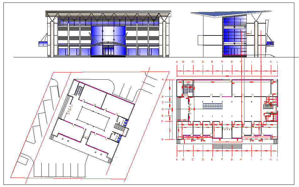 The architecture layout plan of ground floor plan, first floor plan with furniture detailing, section plan and elevation design of Shopping Center plan.Shopping centre plan Detai.