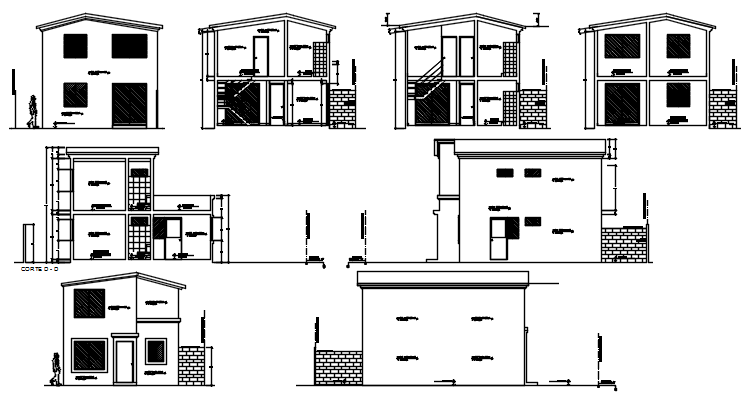 Elevation drawing of 2 storey house in autocad which provide detail of front elevation, back elevation, detail of the section, floor level, etc.