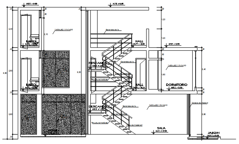 Drawing of house design with detail dimension in autocad which provides detail of the section, detail of floor level, detail of staircase, etc.