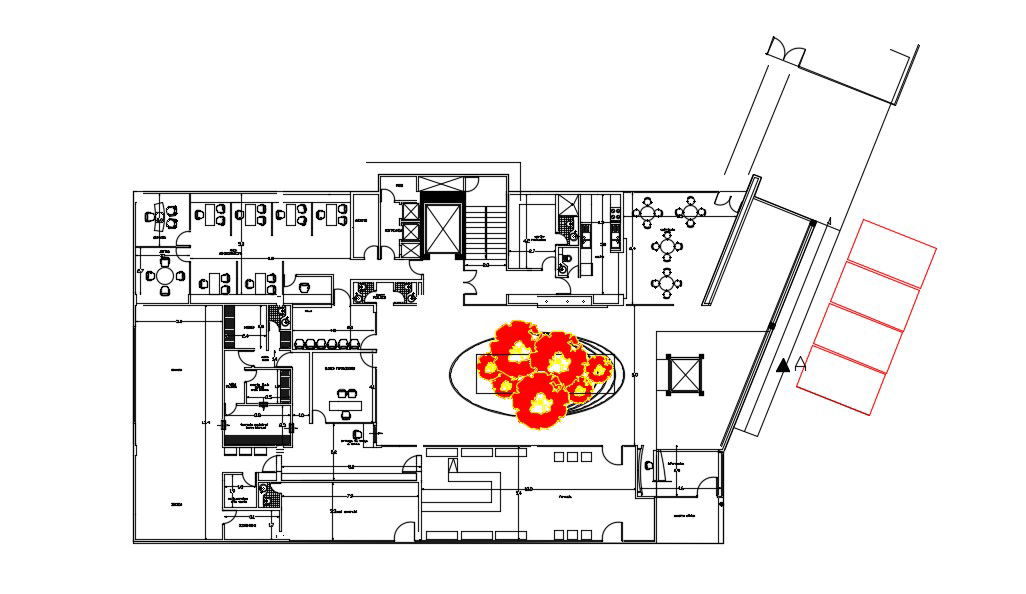 Drawing of clinic plan in AutoCAD which includes detail of reception area, pharmacy area, cafe area, waiting area, cafe area, kitchen area, cabins, etc.
