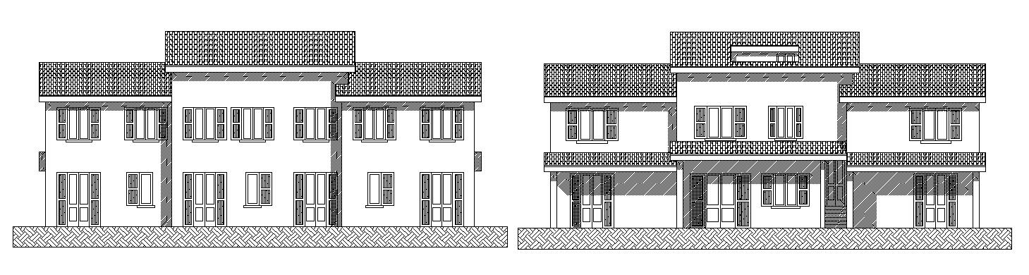 Residential bungalow elevations in AutoCAD it includes front facade, rear elevation it also includes floor level, terrace level,doors,windows,etc
