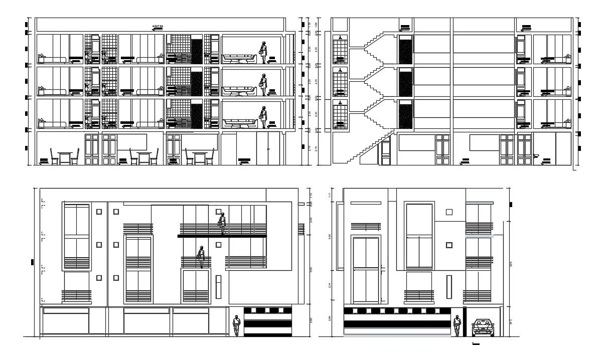 Residential building with elevation details in dwg file which provides detail of front elevation, detail of side elevation, detail of the section, detail of floor level, etc.