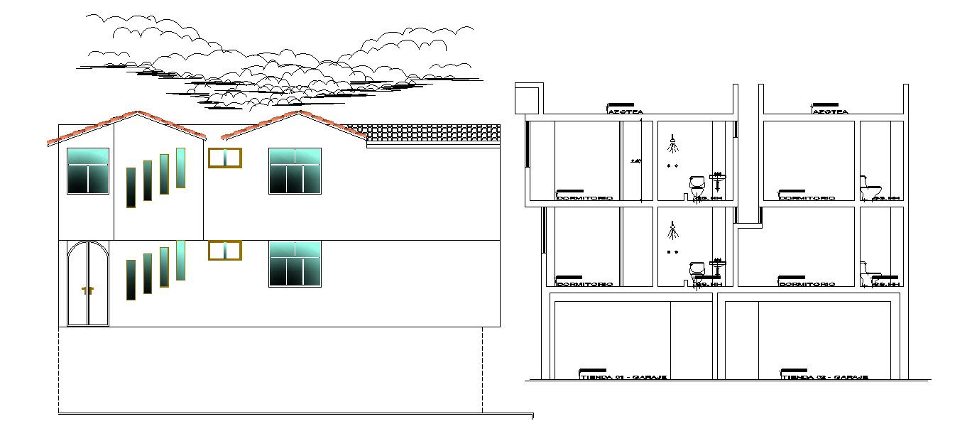House Section Plan In AutoCAD File it includes rear elevation, section it also includes floor level, rooftop, rooms, windows, doors.