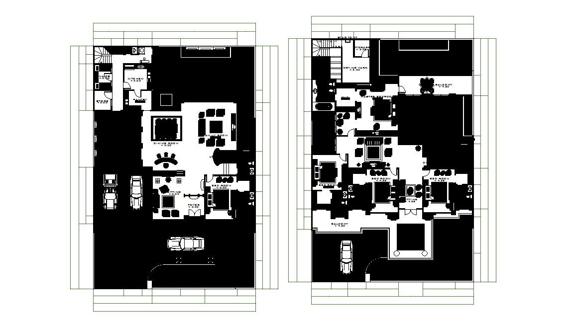 Modern House Layout In DWG File it includes the second floor, third-floor layout it also includes kitchen, drawing room, dining room, bedrooms, bathroom, parking area.