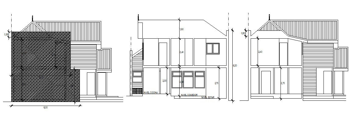 2 Storey Bungalow Design In DWG File which includes detail of front elevation, detail of side elevation.