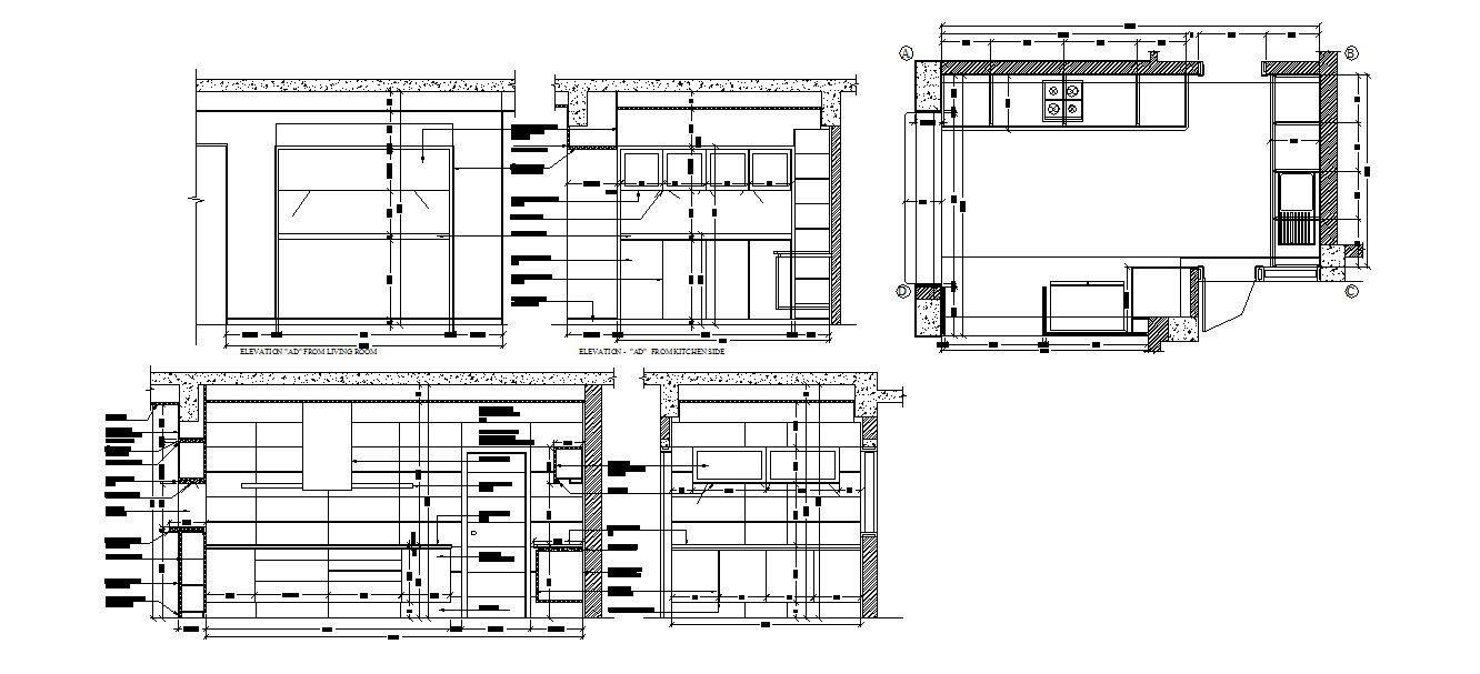 Kitchen Layout In DWG File it includes floor layout, sections it also includes serving platform, drawer, overhead units.