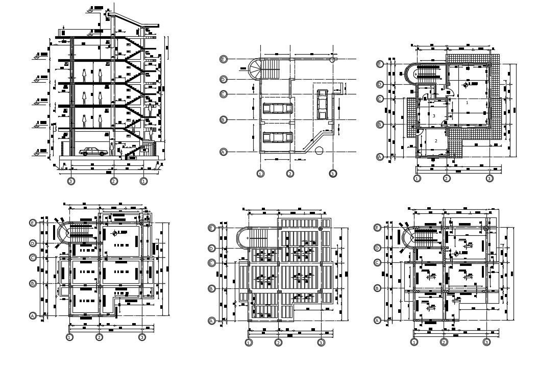 5 Storey Building Design In DWG File which provides detail of drawing room, bedroom, kitchen, dining room, bathroom, toilet. It also gives detail of the parking plan.
