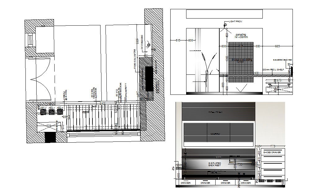 Download Free TV Cabinet Plan In DWG File it includes plan, section,it also includes elevation,t.v cabinet, wooden material used, drawers.