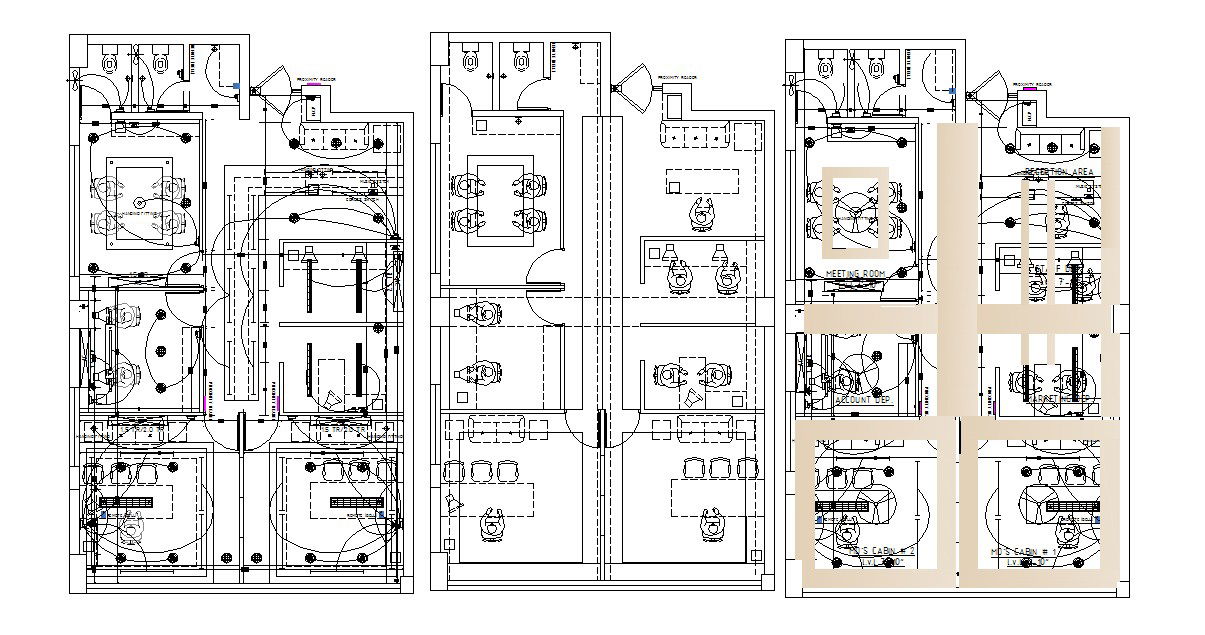 Office Design Plan In DWG File it includes electrical layout, ceiling layout it also includes workstation, cabin, waiting room, reception, meeting room, pantry.