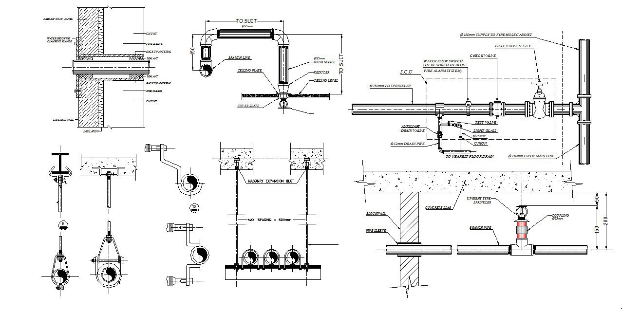 Fire Fighting Plan In DWG File it includes sprinkle detail, sprinkles control detail, clip support for the ceiling.