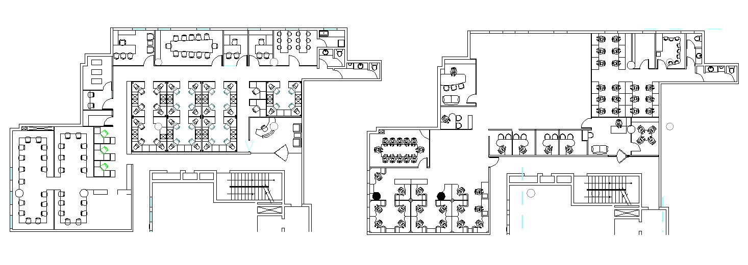 Download Free Commercial Office Layout In DWG File it includes ground floor layout, first-floor layout it also includes a reception area, waiting area, conference room, meeting room, workstation, cabins, managers cabin, pantry, storage.