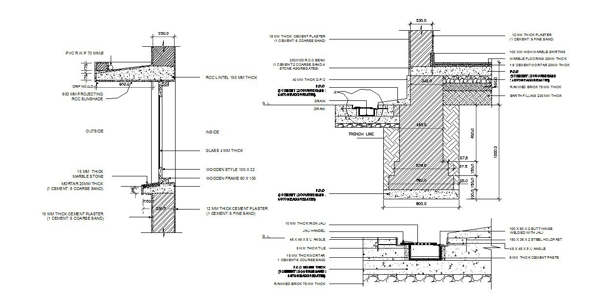 Construction Detail Drawing In DWG File it includes foundation detail, sill level, wall section, drain detail.