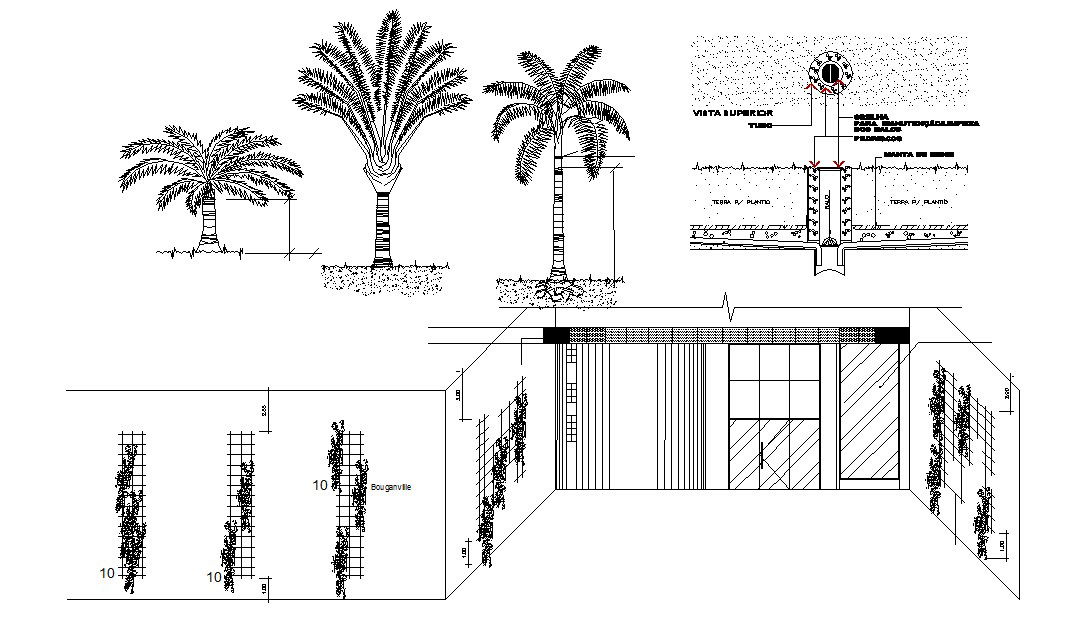 Resort Drawing In DWG File it includes front facade, construction detail, tree blocks.