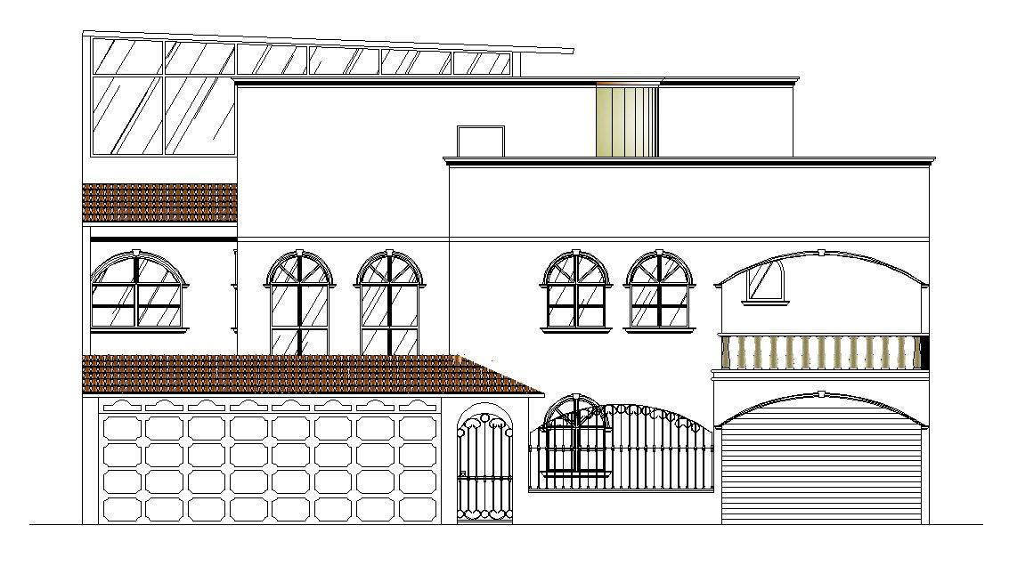 Front facade of the bungalow in dwg file it include front elevation of the house, exterior view it also includes floor level,rooftop,terrace area,door,windows,etc