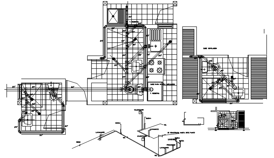 Plumbing layout of bathroom in autocad it includes floor layout, furniture layout,piping layout it also includes w.c,basin,shower area,etc