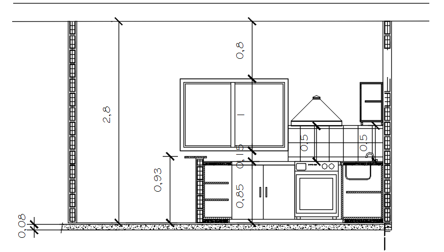 Dwg file of kitchen section it includes sectional elevation of the kitchen,it also includes serving platform,chimney, windows,etc