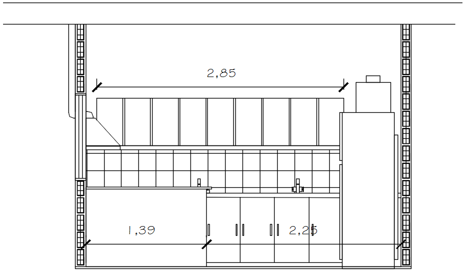 Dwg file of kitchen section it includes sectional elevation of the kitchen,it also includes serving platform,chimney, windows,etc