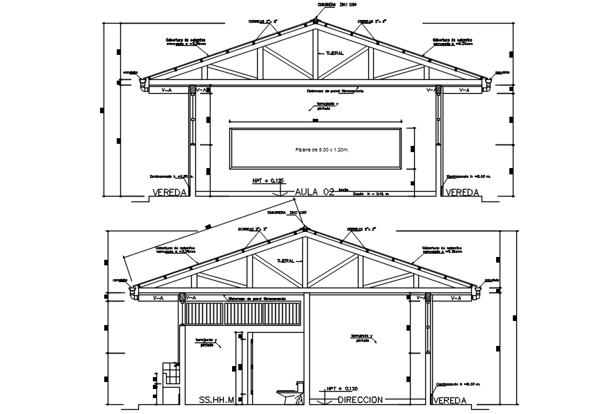 Sectional elevation of a bungalow in autocad include ground level,terrace level,truss detail,rooms,etc