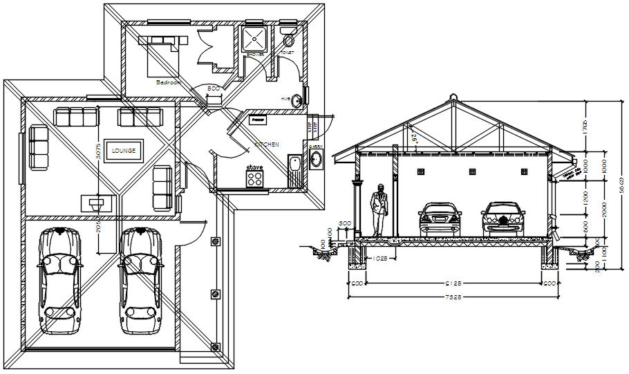 Autocad drawing of residential bungalow it include floor layout,furniture layout,sectional elevation it also includes kitchen,drawing room,dining room,bedrooms,toilets,bathroom,parking area,etc