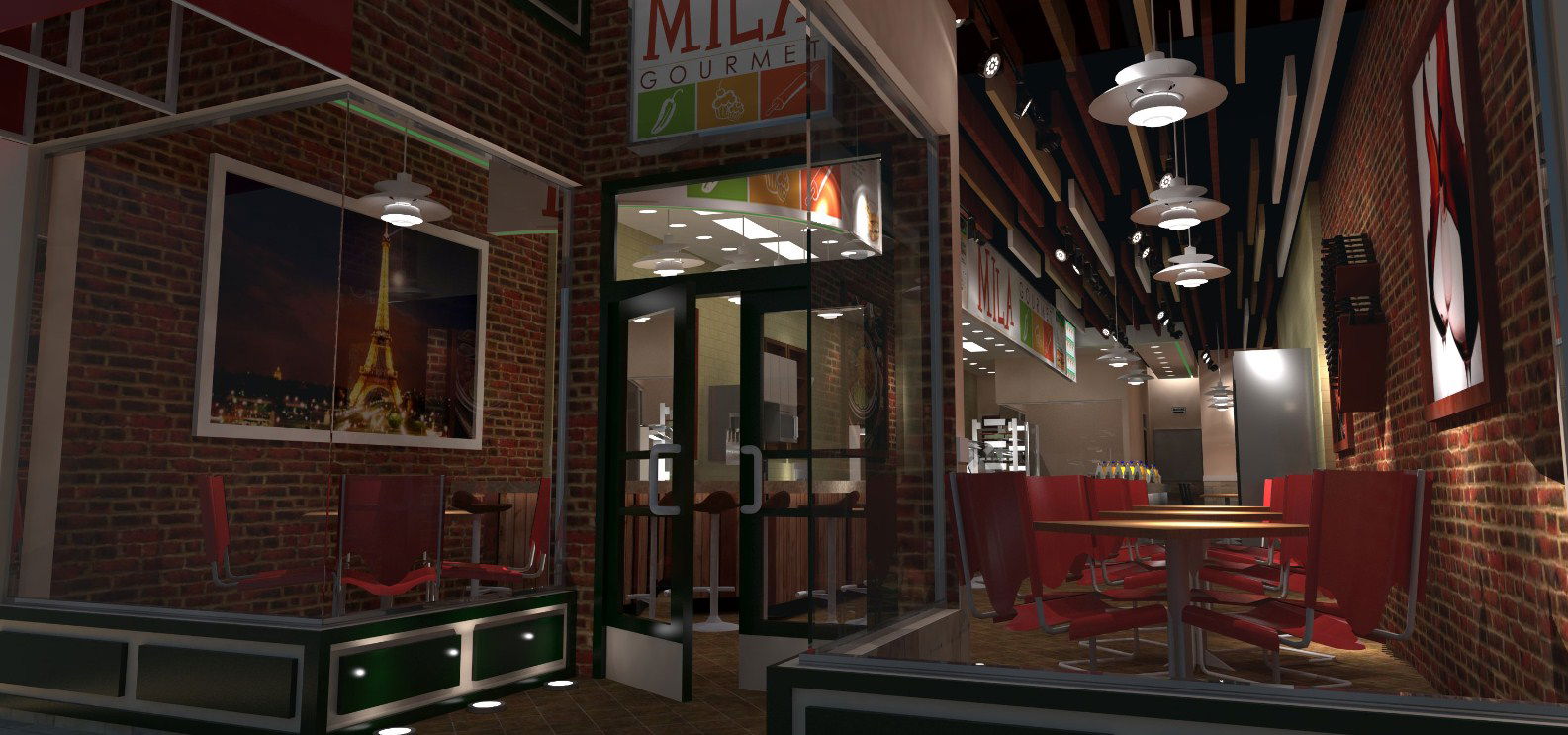 3D drawing of restaurant it include view of the seating area,bar area,lighting,table,chairs,exposed brick wall,etc