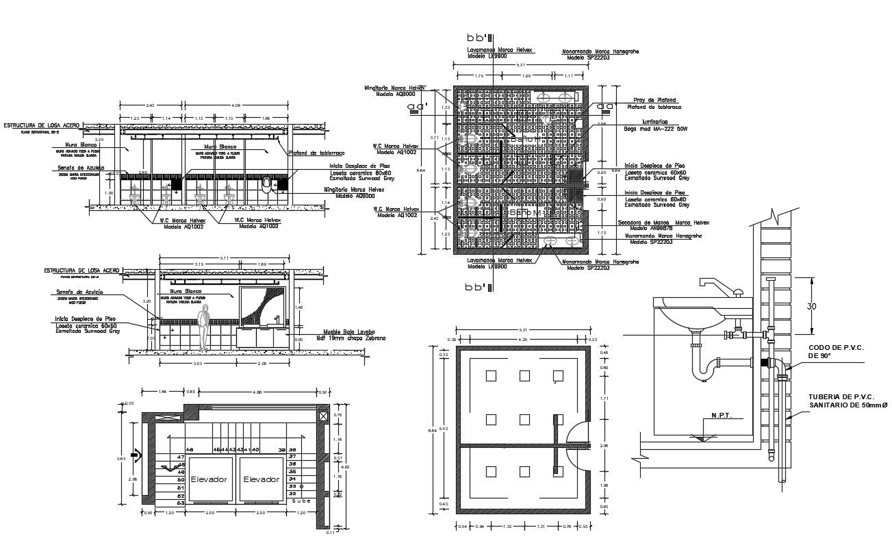 Autocad drawing of toilet layout of the hotel it includes plan,section,construction detail of sink,staircase layout,etc