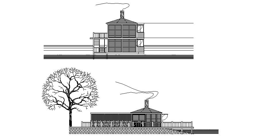 Autocad drawing of bungalow elevations it includes front facade, rear elevation it includes floor level,rooftop,balcony,rooms,etc